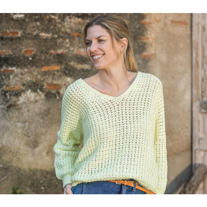 When I first saw a photo with a twisted back sweater, I immediately saved the photo and put it on my to crochet list. It took me a while to figure it out how to do it and I had to undo several times, but I end up with the Sunlight Twisted sweater, a pretty design and easy pattern. The skill level required to complete this project is intermediate. You have to know how to increase, decrease when working with a lace stitch pattern. But if you are ready to take out the best of you, even if you are a beginner, you can do it! And don´t get intimidated by the twisted back, there are just 2 panels twisted and then stitched together.