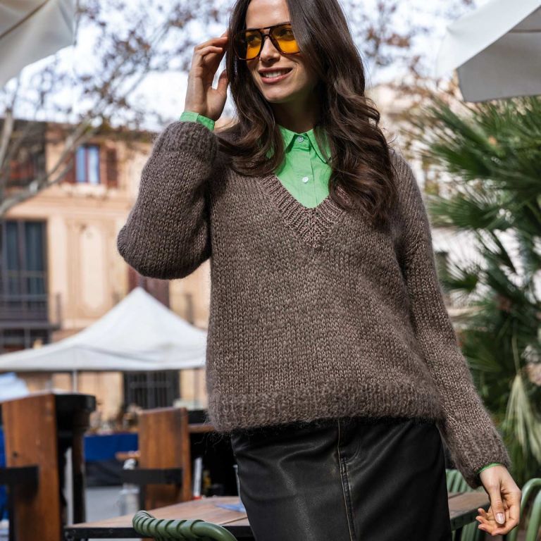Create a basic women’s sweater with an elegant combination of Katia Ingenua and Katia Gatsby. This design stands out for its V-neckline, knitted with the soft shine of Gatsby. Easy to pair with shirts or basic tees, it’s a versatile and comfortable sweater. Add a special touch to your wardrobe with this pattern from the Katia Sport 119 magazine!