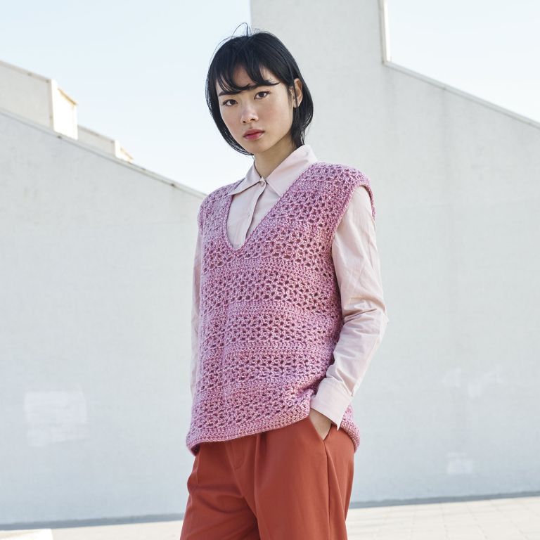 Cotton-Merino V-neck vest crochet pattern Give your looks a retro vibe with a crochet vest made with Cotton-Merino. A V-neckline pattern that combines crochet stitches forming horizontal stripes. Without a doubt, the star piece of the season!