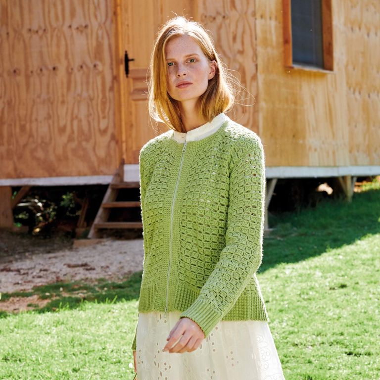 Cotton-Yak zipped cardigan crochet pattern This checkered stitch crochet cardigan is the perfect wardrobe staple. Its round neck and large crochet ribbing add a touch of elegance, while the zip adds a modern vibe. We suggest working with Cotton-Yak, a cotton and yak blend, in a fun color that goes with romantic dresses.