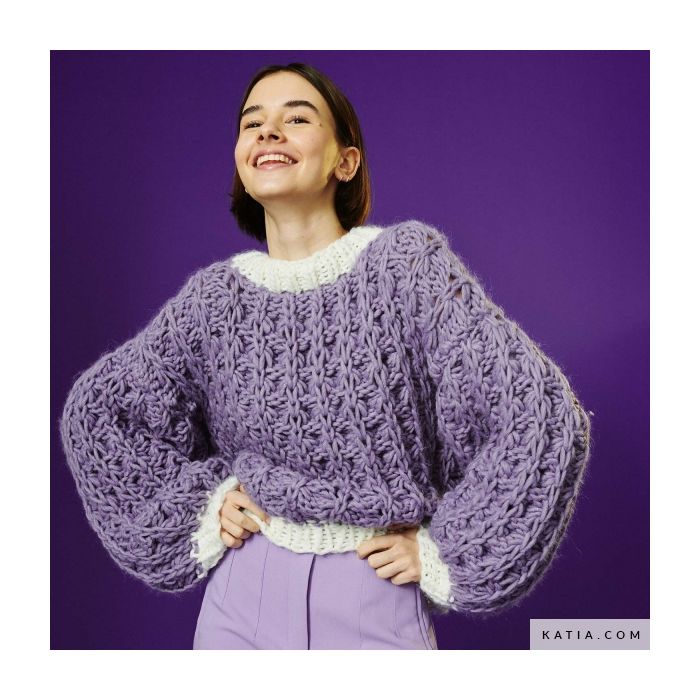 Surprise with the Aurora textured sweater, created by @mamaemi.tejidos with the thick WOW! Chunky wool. Knit a sweater with puffed sleeves and voluminous texture with a contrasting color collar, cuffs, and elastic hem. Dare to create your own color combinations and have fun knitting this winning pattern from the Katia Designers Wow Edition creative contest!