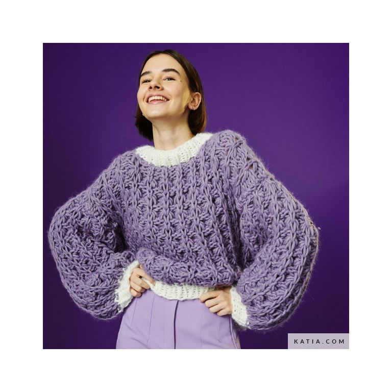 Surprise with the Aurora textured sweater, created by @mamaemi.tejidos with the thick WOW! Chunky wool. Knit a sweater with puffed sleeves and voluminous texture with a contrasting color collar, cuffs, and elastic hem. Dare to create your own color combinations and have fun knitting this winning pattern from the Katia Designers Wow Edition creative contest!