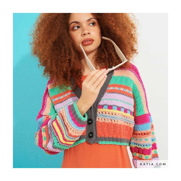 You'll fall in love with this colorful cropped cardigan design! Knit using soft Summer Vibes yarn by WOW! by Katia, this cropped bolero, designed by @studioceliahoste, is an explosion of color. Fastened with three tailor buttons, this cardigan is the perfect accessory to radiate personality. Show off your creativity!