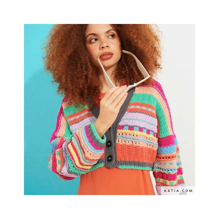 You'll fall in love with this colorful cropped cardigan design! Knit using soft Summer Vibes yarn by WOW! by Katia, this cropped bolero, designed by @studioceliahoste, is an explosion of color. Fastened with three tailor buttons, this cardigan is the perfect accessory to radiate personality. Show off your creativity!