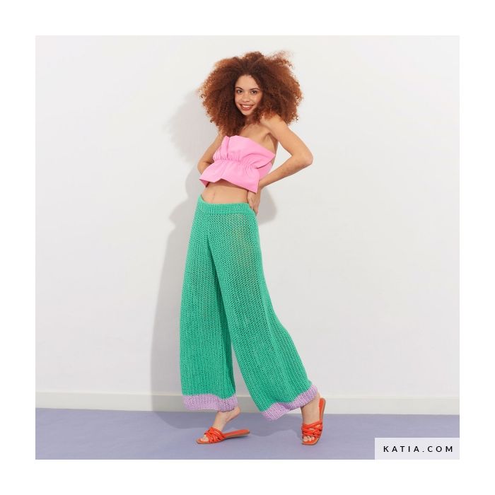 These Palazzo pants are the perfect piece to wear with style this summer! Make your Maya pants designed by @studioceliahoste using Summer Vibes yarn by WOW! by Katia. Enjoy a unique design featuring a lace pattern and a contrasting color at the hem of the pants. Transform your wardrobe with these modern and innovative knitting pants, perfect to look elegant during your summer holidays.