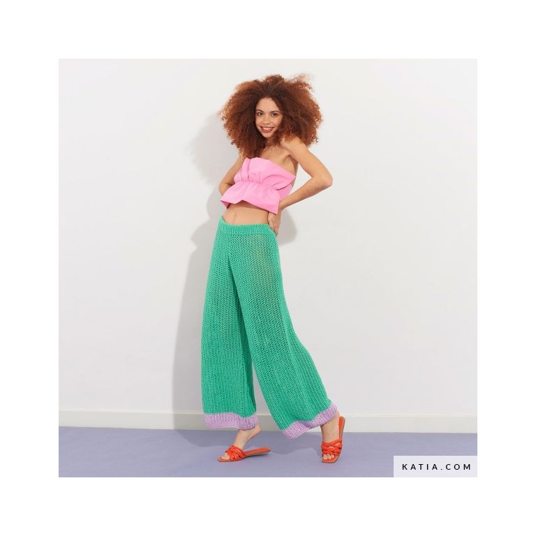 These crochet Palazzo pants are the perfect piece to wear with style this summer! Make your Maya pants designed by @studioceliahoste using Summer Vibes yarn by WOW! by Katia. Enjoy a unique design featuring a lace pattern and a contrasting color at the hem of the pants. Transform your wardrobe with these modern and innovative crochet pants, perfect to look elegant during your summer holidays.