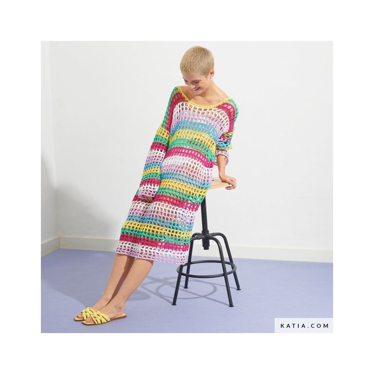 Wear the latest trend with this beautiful multicolored midi dress designed by @studioceliahoste! Crochet this striped mesh design in the most vibrant tones of Summer Vibes yarn by WOW! by Katia. The perfect dress to play with sheer sections, with a touch of glamour and sexiness. You’re unique and so is your Noah dress!