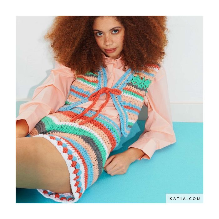 Joining the vibrant color trend has never been easier! Make this summer memorable with this cool and fun Sophie set designed by @studioceliahoste. This multicolored vest features a beautiful lace design to add texture to your look. It goes perfectly with the colorful double crochet shorts; stand out in this outfit! Enjoy the comfort and softness of Summer Vibes yarn by WOW! by Katia. This is your opportunity to shine bright this summer and look amazing at the same time!