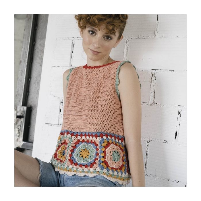 Every season, fashion falls head over heels for the charm of granny squares. At Katia, we suggest making this summer must-have with your own two hands: a flower crochet top, with wavy borders and plenty of color. The African Daisy Summer Top by @ameskeria made with balls of Fair Cotton in 6 different colors.