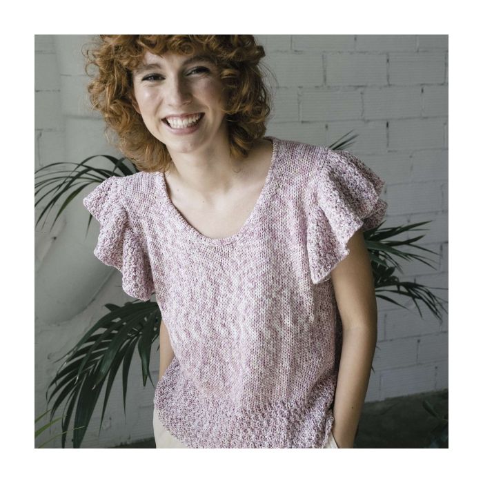 Update your spring-summer wardrobe with this knitted top with ruffle sleeves designed exclusively by @knitting. The Amapola Top made with balls of Re-Tape Craft .