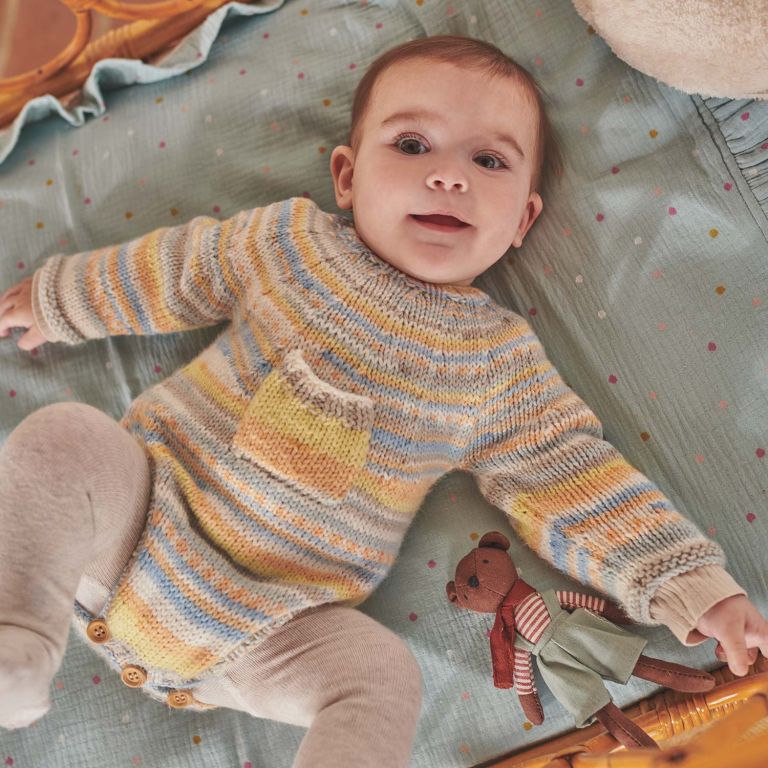 Baby Jacquard circular yoke body pattern with pocket Knit a circular yoke baby bodysuit with a pocket using Baby Jacquard yarn with our pattern available in PDF format and in the Katia Baby 106 magazine. With long sleeves and a sweet print, this design includes instructions for knitting a romper for babies aged 3 to 24 months. Put your skills to the test with straight and circular knitting needles!