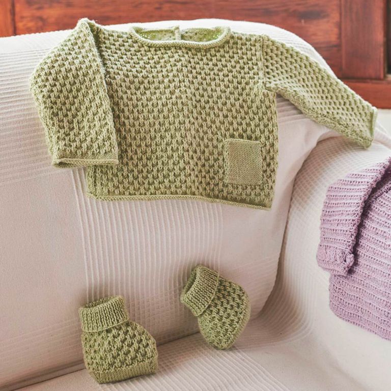 Baby Nature baby sweater with pocket and booties pattern Knit an adorable baby sweater with our PDF pattern, also available in the Katia Baby 106 magazine! Use our organic Baby Nature yarn in pastel shades to create a soft and comfortable set perfect for any time of year. With detailed instructions for knitting a sweater set with a decorative pocket and booties in sizes from preemie to 6 months. Dare to knit something special for your little one!
