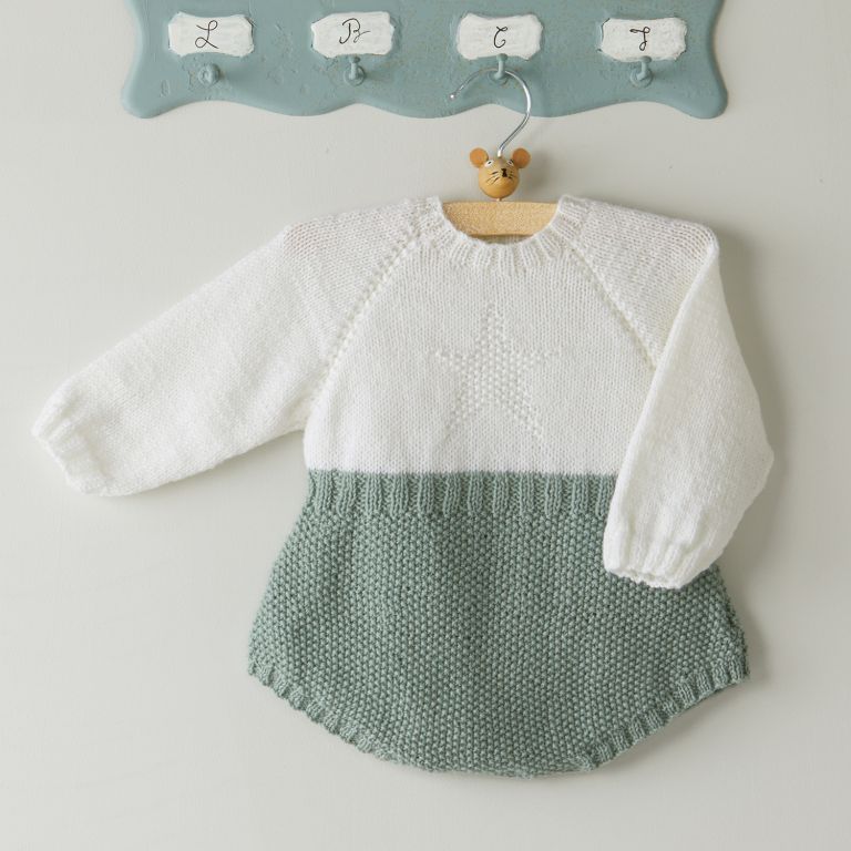 Beautiful baby romper with the nappy cover part in pale green, this winters trend colour. The jumper section with raglan sleeves is knitted in stockinette stitch in white with a star motif in moss stitch.
