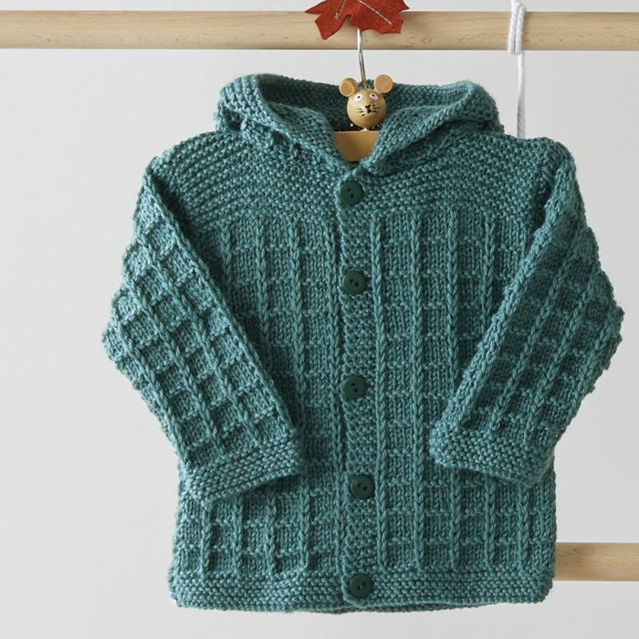 You can knit this long button through hooded jacket in emerald green for your baby using 3 to 6 balls of Basic Merino. This easy pattern includes garter stitch, square relief stitch and round buttonholes, all of which are within the capabilities of beginner knitters.
