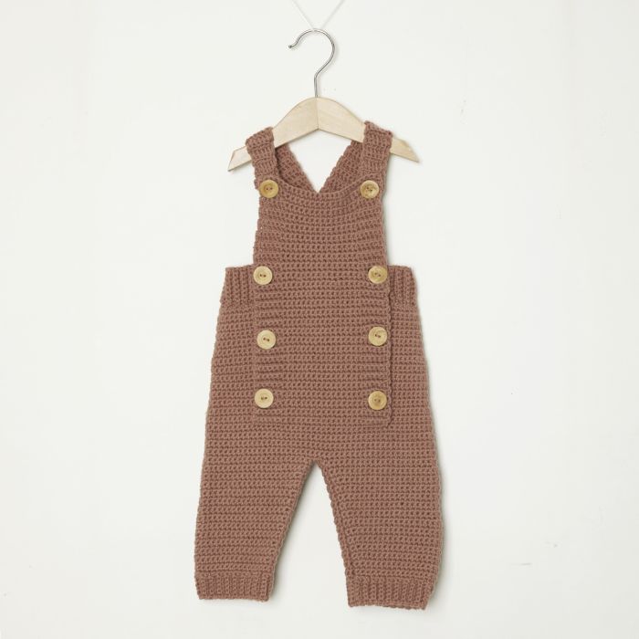 Cotton in Love crochet baby overalls pattern You practically only need to work in single crochet to make these baby overalls with crossover straps at the back. The front of these crochet overalls made with Cotton in Love is decorated with 8 wooden buttons.