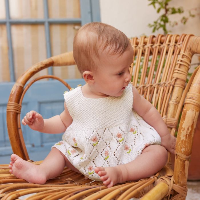 This charming sleeveless top for babies, knitted with Comfort Cashmere by Concept by Katia, offers both softness and coolness. Featuring seed stitch on the top section and lace with embroidered flowers on the lower part, it is comfortable and ideal for warm days. Create this unique garment and enjoy the joy of knitting.
