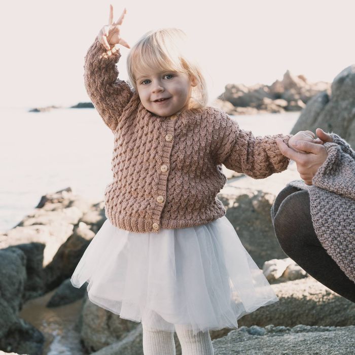 Baby Nature button-up jacket knitting kit This organic wool baby jacket, knit with Baby Nature, is a wearable garment with straight lines and a round neckline. It features 5 wooden buttons, and the fantasy stitch kit has a retro vibe thanks to the powdery colorway.