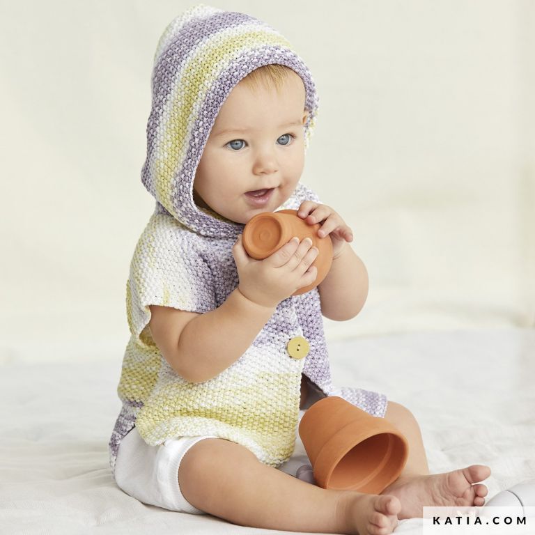 If you’re looking for a cool and modern garment for your baby, we suggest this easy pattern to knit a short-sleeve hooded button-up jacket. Colorful Dahlia adds a fun vibe and a soft and fluffy feel. Without a doubt, Dahlia is the perfect yarn for baby garments. Follow the instructions to knit this garment in sizes 3 to 24 months.