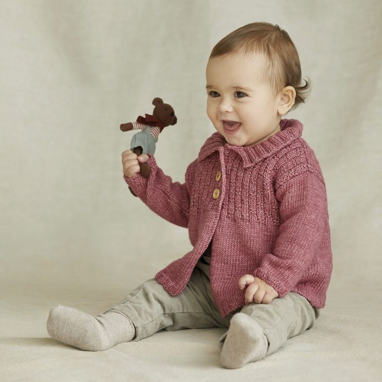 Cotton-Merino Fine knit baby cardigan pattern A charming baby jacket that combines stockinette stitch, 2x2 rib, and textured stitches. A pattern made with Cotton Merino Fine and finished with 3 buttons to close the yoke section.