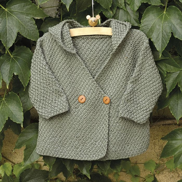 Baby cardigan with crossover front fastening in double moss stitch. Using Cotton 100% and perfect for Spring or Summer, this babies cardigan jacket features long sleeves, button front and hood.