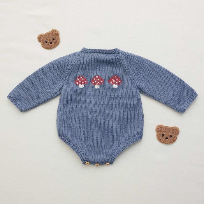 Knit this long-sleeved baby bodysuit for a cozy and charming piece. Designed with raglan sleeves, it opens at the back with five buttons and at the crotch with three, for easy changing. The stockinette body features three embroidered mushrooms as a finishing touch. Make it with Concept Merino Baby or Katia Peques for a soft, practical, and very special garment.