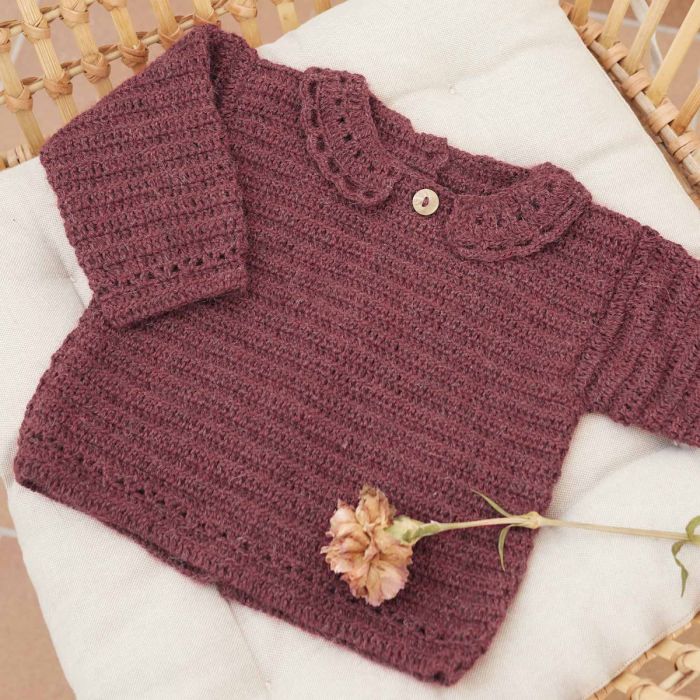 Crochet this delicate baby sweater with love using Concept Alpaquina—a soft, machine-washable alpaca yarn ideal for everyday wear. Fully open at the back for easy dressing, it combines double crochet with a fantasy stitch Peter Pan collar, a decorative front button, and subtle lace along the hem. Enjoy the craft of creating comfortable and thoughtful garments for your baby.
