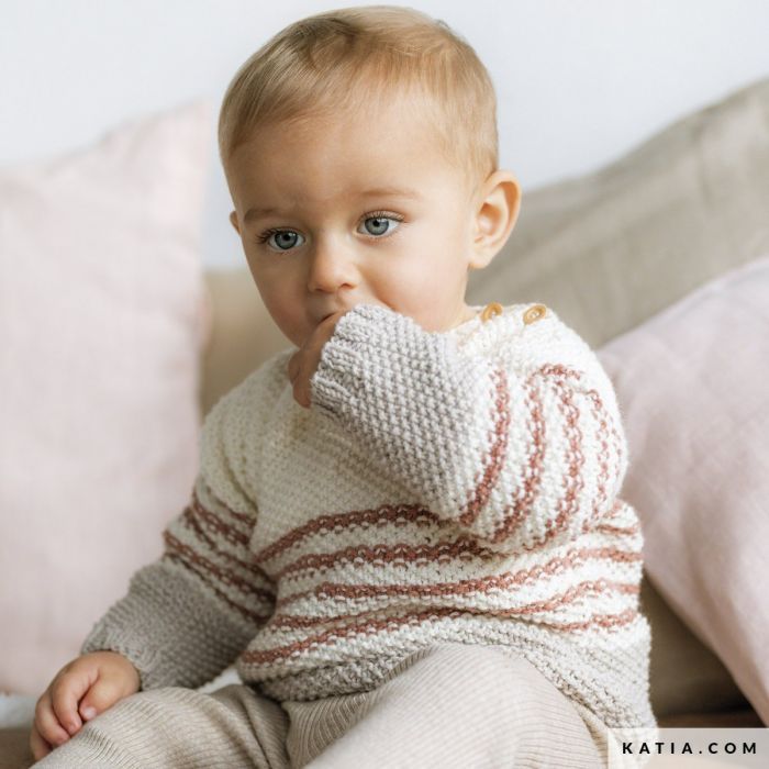 Knit a simple three-toned moss stitch baby sweater with our Cotton In Love yarn. This easy pattern combines 3 delicate colors that are ideal for baby garments. Enjoy knitting a striped design with contrast color blocks at the hem and sleeves. Finish this adorable garment with some wooden buttons at the shoulder.