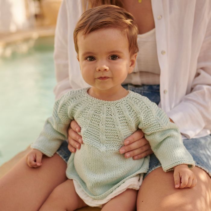SeaCell Cotton baby sweater and booties kit This cute baby sweater is knit seamlessly, with a round yoke and garter stitch finishes. The back is open and is fastened with some buttons, so that you can dress your baby easily. This sweater is available in sizes newborn to 6 months, and is made with SeaCell Cotton, a soft and comfortable yarn. Dress your baby in the matching sweater and garter stitch baby booties. The kit comes in sizes 0 to 3 months, and the ankle strap fastened with a wooden button allows you to adjust the size to your baby’s feet.