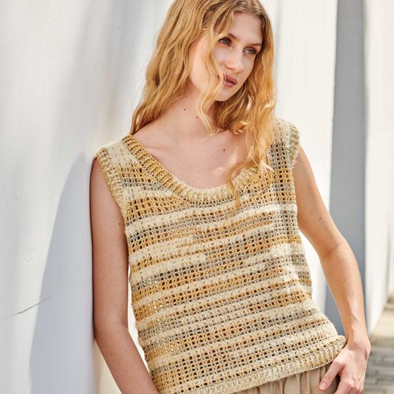 Add a handmade vibe to your summer wardrobe with this sleeveless crochet top, featuring a deep round neckline and wide armholes. Its simple yet refined design comes to life with Lua by Concept by Katia, a yarn with a soft, plush-like texture and a delicate gradient effect. Get carried away by the rhythm of the stitches and enjoy the creative process.