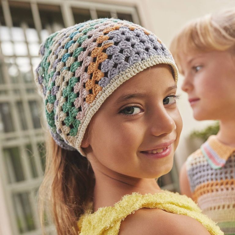 Crochet this charming bandanna with Katia Fair Cotton Diverso, an organic cotton yarn bursting with color. Its triangular granny square-inspired design is cool and perfect for summer. Enjoy every moment of your daily crochet time as you make a stylish and colorful accessory for your child.