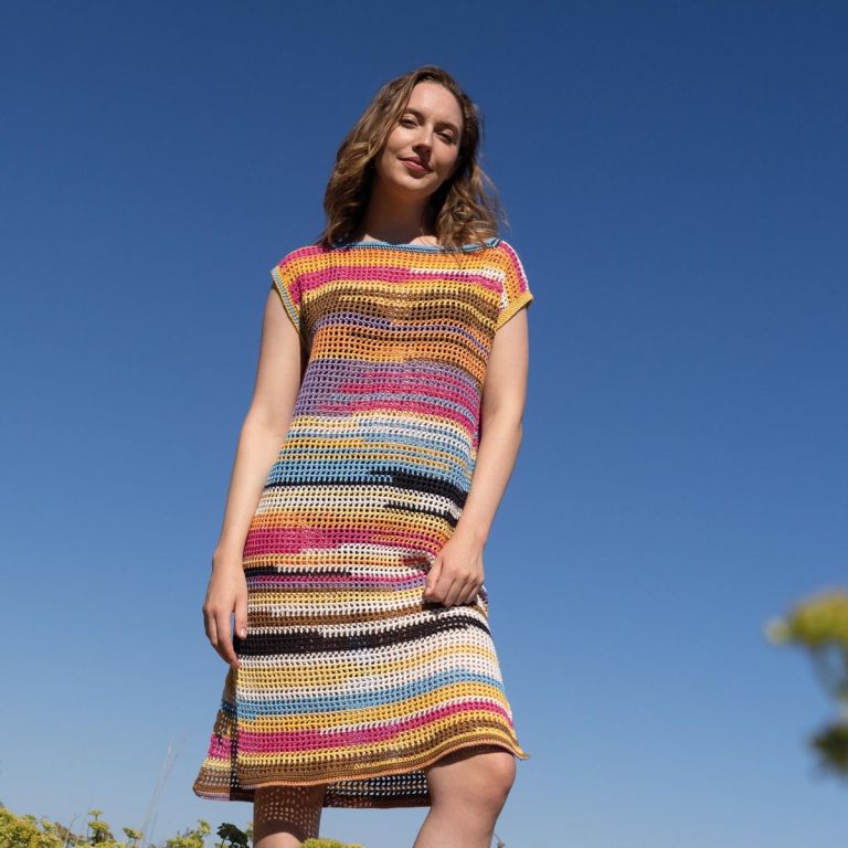 Make a light and breezy crochet dress with Katia Fair Cotton Diverso, a colorful organic cotton yarn. Its straight design, worked in a mesh stitch with side slits, makes it a comfortable and easy-to-make garment. Perfect for the hottest days, whether at the beach or strolling under the sun. Enjoy the pleasure of creating your own style with your hands.