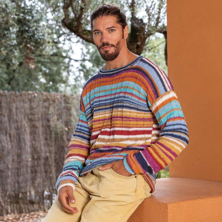 Discover this men’s straight sweater pattern, knitted with Katia Fair Cotton Diverso, featuring elegant vertical textures and a multi-stripe effect. With its round neckline and versatile design, it complements any look. Experience the joy of knitting a unique and sustainable must-have for your spring-summer wardrobe.