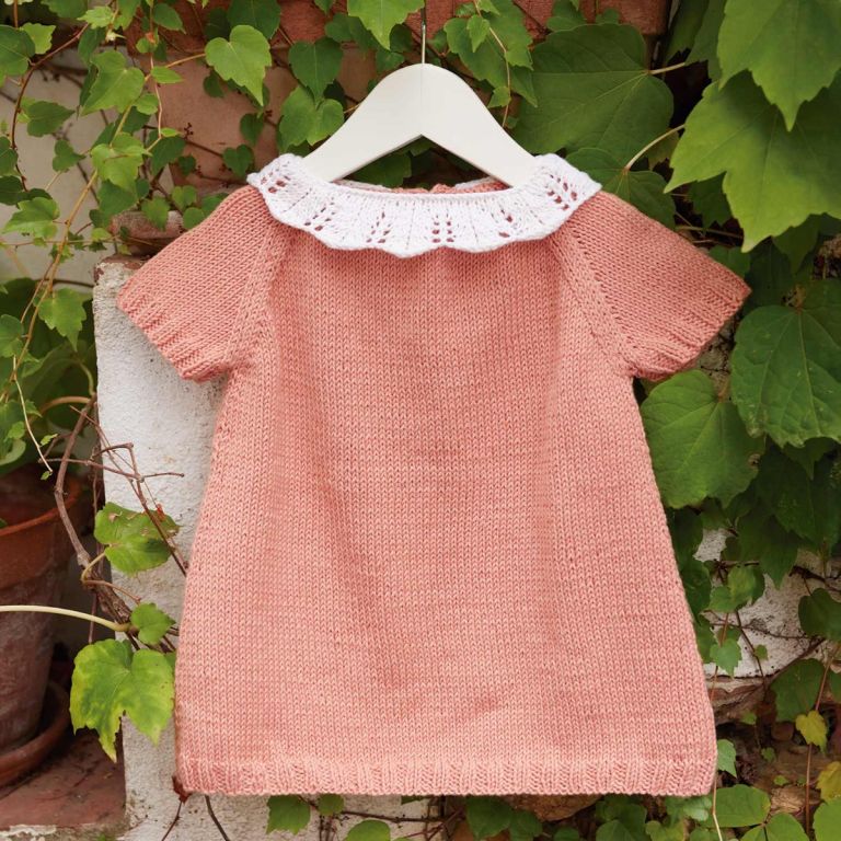 Knit this delicate summer dress for babies with Cotton-Cashmere by Concept by Katia. Its design features raglan sleeves, an elegant lace ruffle at the neckline, and a practical back opening fastened with buttons. Perfect for babies aged 3 to 24 months, it is ideal for spring and summer. Experience the joy of creating something unique with your hands.