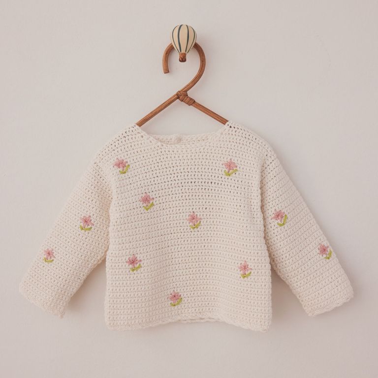 Crochet this sweet baby sweater with Comfort Cashmere by Concept by Katia, a soft blend of cotton and cashmere. Its simple single crochet design, with embroidered flowers and a back opening, makes it practical and special. Enjoy the satisfaction of creating a unique piece with your own two hands.