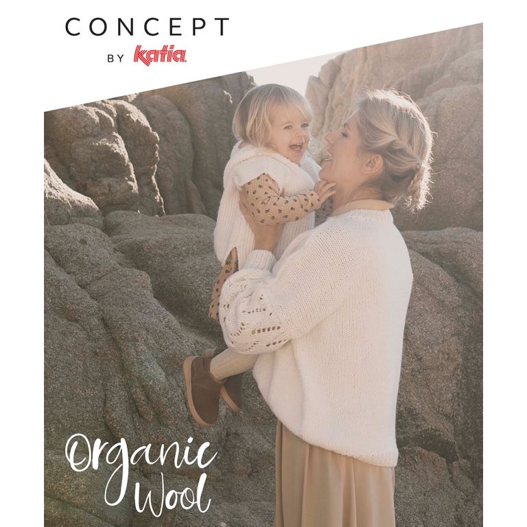 Katia Organic Wool is a monographic magazine with knitting patterns using two chlorine-free, non-museling, GOTs-certified organic yarns: Katia Baby Nature and Pure Organic Wool by Concept by Katia. 100% soft, lovely, and special yarns! Like that unique bond between mother and baby that inspires this series of matching garments. We suggest knitting 4 baby patterns with the wonderful Katia Baby Nature: a button-up cardigan, long strappy overalls, a hooded vest, and a sweater with dogs in contrasting stitches. And 4 women’s patterns using Pure Organic Wool, a worsted weight yarn for 6-7-mm needles: a maxi dress, comfortable sweaters, and an oversized vest.