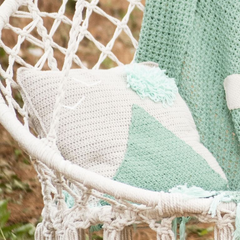 Crochet cushion cover with geometric design. MEASUREMENTS: 15 3/4” x 15 3/4” (40 cm x 40 cm)