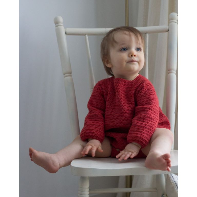 The Etienne Romper is a one-piece baby garment featuring a sweet bubble body, long sleeves, and button closures on the back and diaper flap for convenience. Crocheted with Concept Cotton Cashmere yarn, this precious romper is an enduring piece for little one.