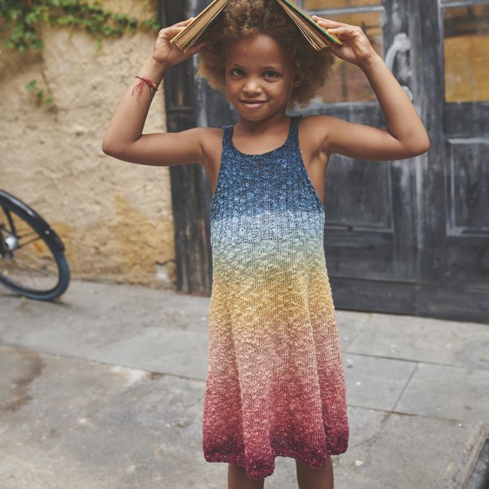Polynesia Gradient free children’s dress pattern This wonderful children's dress is modern and beautiful. This surprising Polynesia Gradient yarn changes color softly, creating an incredible gradient effect. Its A-line skirt, straps, and round neckline give it a modern look. It's the perfect piece for any special occasion.