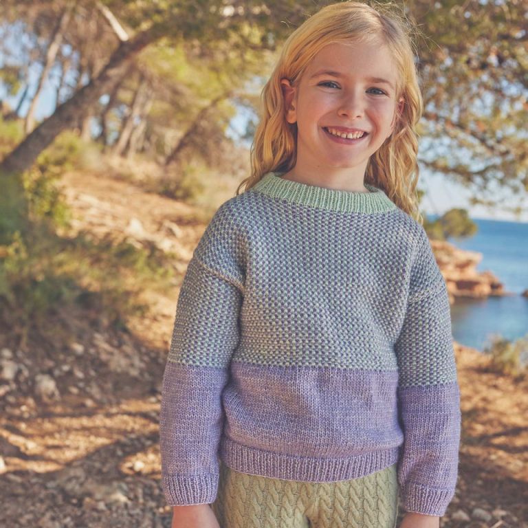 Knit a charming two-toned sweater for children with this knitting pattern! Use the soft Cotton-Merino Fine blend of cotton and wool to create a beautiful textured granite stitch on the upper part of the garment. Perfect in pastel tones, it is ideal for wearing with jeans or leggings. Get inspired and start knitting this pattern today!