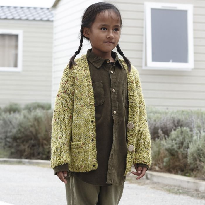 Charming confetti effect cardigan. Easy to knit: you only need to know 2x2 ribbing and stockinette st. If you have any doubts, consult our basic stitches videos by clicking on the names of the stitches used (below level of difficulty).