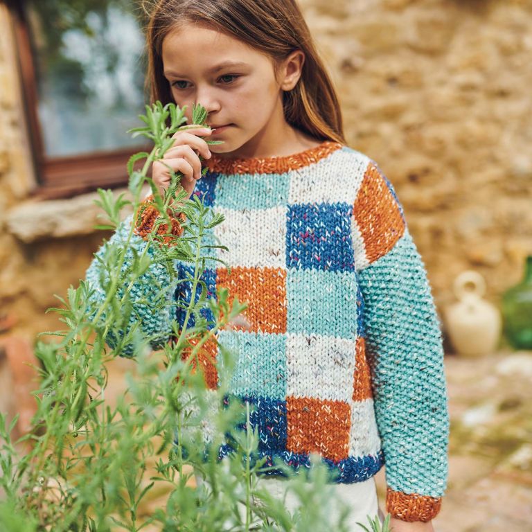 Pluton children’s patchwork square sweater pattern Add a modern touch to your spring wardrobe with this children’s patchwork square sweater! Made with fun Katia Pluton yarn, the design combines stockinette stitch and intarsia, a wide range of colors, and moss stitch sleeves. The 2x2 ribbing for the collar, cuffs, and hem completes a striking look that is not complicated to knit, with instructions for sizes 4-8 years old.
