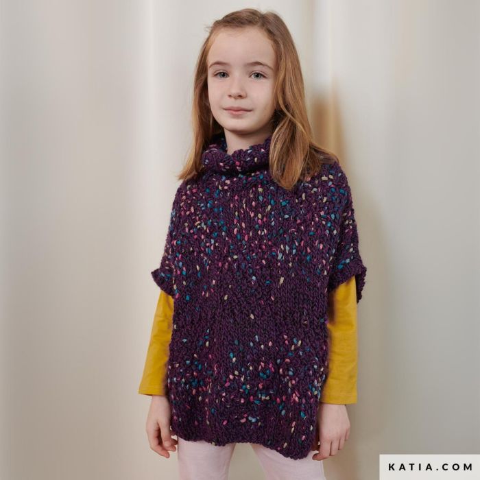 The star piece this Autumn, because of its comfort and ease of knitting: the knitted poncho! This pattern provides instructions to knit a long children’s poncho with a high neck and 2x2 rib finishes. Achieve a fun design thanks to the colored speckles from the Azulejo yarn.