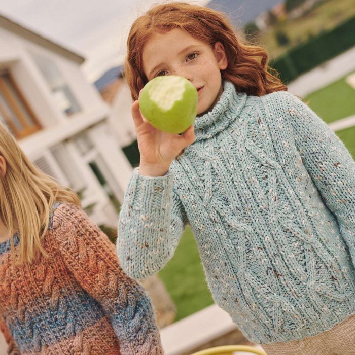 Pluton high neck and center cable sweater kit Are you looking for a high-neck sweater for your kid? This design in Pluton, a tweed-effect speckled yarn, is perfect! Knit a sweater with a 2x2 rib high beck, stockinette stitch sleeves, and a center cable motif on the front.