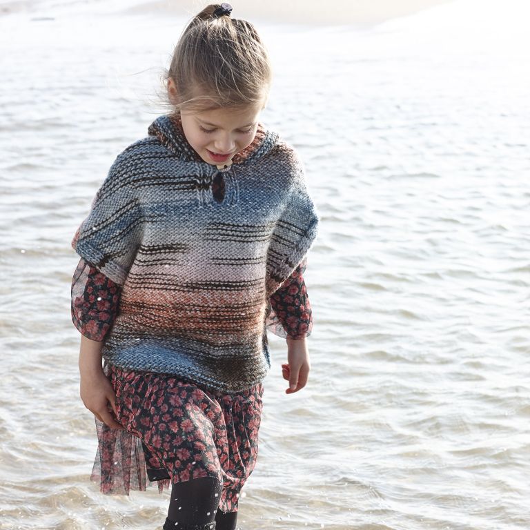 Sleeveless poncho with hood for sunny winter days, available in sizes 4, 6 & 8 years. This is an easy pattern to knit and comfortable to wear with trousers, skirts and dresses.