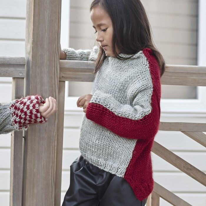 Easy to knit bicolor sweater with a gray front and a longer length back in red. The sleeves are knitted in intarsia to create this original sweater in two colors.