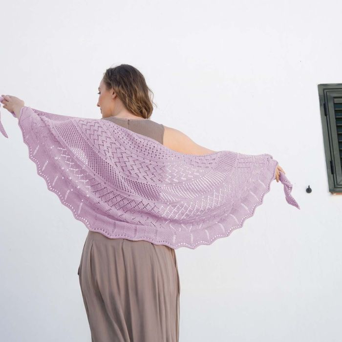 Wrap your senses in this exquisitely designed shawl combining lace motifs and geometric textures. Get ready to elevate your creative soul with the L’Anima shawl design!To participate, all you need is the 2025 L’ANIMA SHAWL KAL KIT, which includes 8 balls of Cotton-Cashmere Concept by Katia in your favorite color.