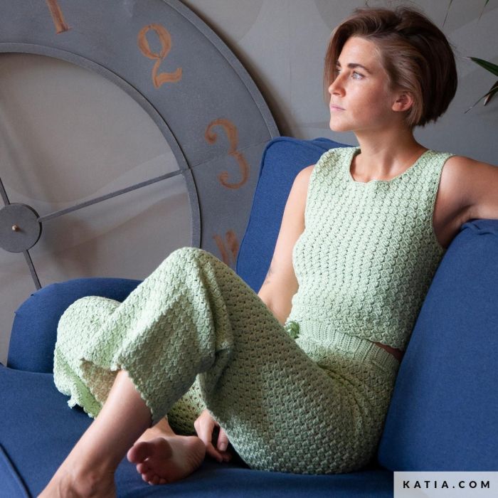 If you want to stand out with a matching crochet top and pants set, this Premium Designers pattern is ideal. Crochet designer Tanja Adolfsson suggests combining two designs: the Ronja crochet pants and the matching Lovis crop top. To make your Lovis&Ronja set, you just need balls of Katia Capri, in your favorite colors, as always.