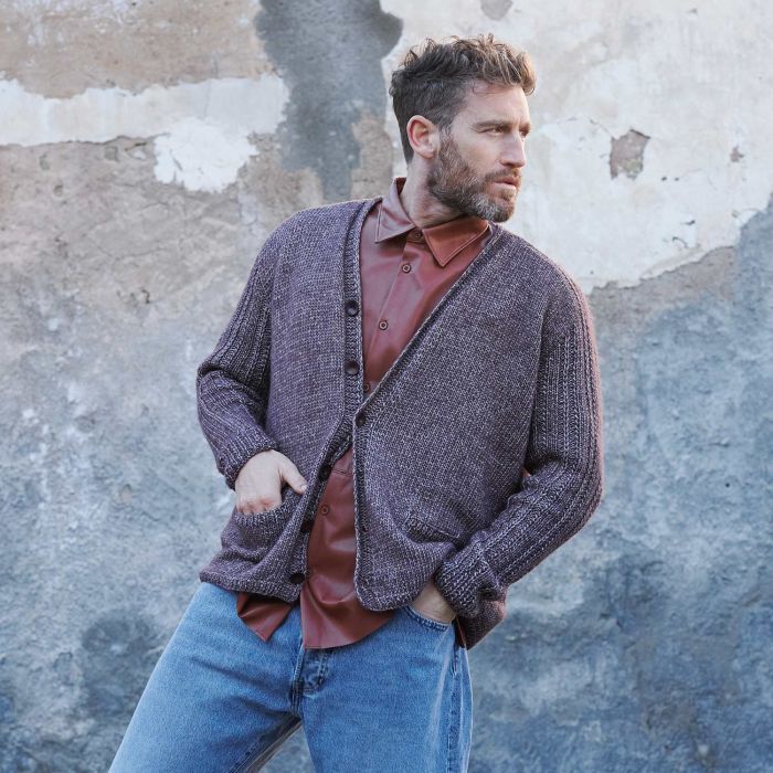 Cotton-Merino men’s retro cardigan kit This men’s cardigan kit will make you stand out in a crowd. Designed with a retro yet very current style, it features a large V-neckline, doubled edges and diagonal line stitch on the right side. Knitting it with Cotton-Merino offers a unique experience: this thread combines the warmth of cotton with the lightness of merino wool for a warm garment that is super soft to the touch. With this pattern, you’ll be comfortable and stylish!