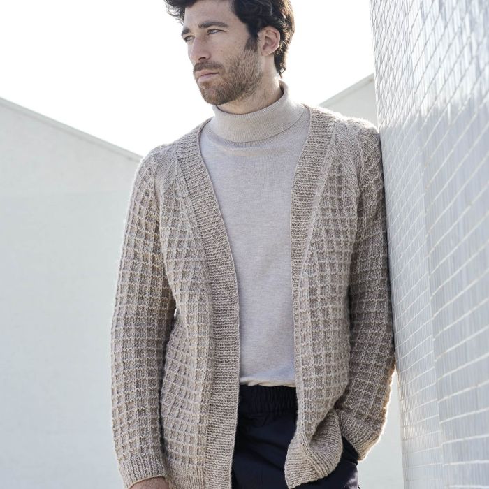 Cotton-Merino waffle stitch men’s cardigan pattern Follow this pattern to knit a men’s raglan-sleeve cardigan with Cotton-Merino. Create a textured grid waffle-style stitch pattern, featured in two more designs to knit a matching garment for each member of the family.