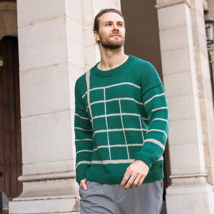 Knit an original plaid sweater for men with Katia Merino Aran. This round-neck design combines stockinette stitch, intarsia, and crochet details to create colored lines on the body and sleeves. Dare to learn new techniques with this pattern!